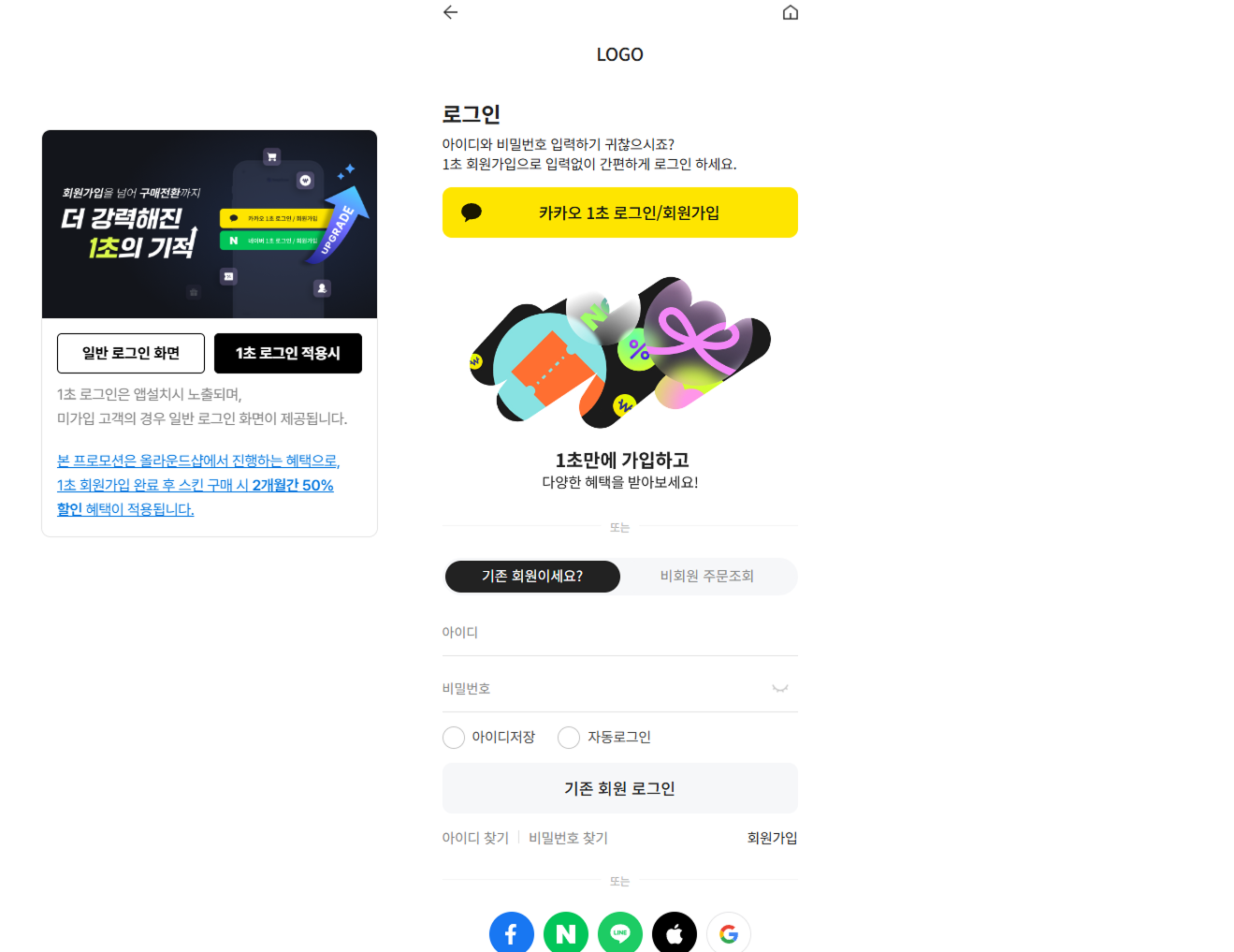 클릭 한 번으로 가입 + 로그인까지 완료 → 비회원 구매 고객도 자연스럽게 회원으로 전환됩니다.